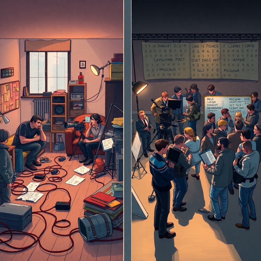 Классическая вертикаль «режиссёр — продюсер — линейный продюсер — департаменты» работает не всегда. Для сверхмалых авторских проектов выгоднее модульная архитектура, когда каждый блок (камера, свет, звук, арт) подбирается как мини-команда со своим координатором. Такие «модули» можно подключать и отключать по мере надобности, не держать всех людей во всех сменах и легче маневрировать бюджетом. В 2021–2023 годах многие независимые режиссёры в России и Европе переходили к подобным гибридным форматам, чтобы не попадать в жёсткую студийную иерархию, но при этом не жертвовать профессиональным производственным стандартом.